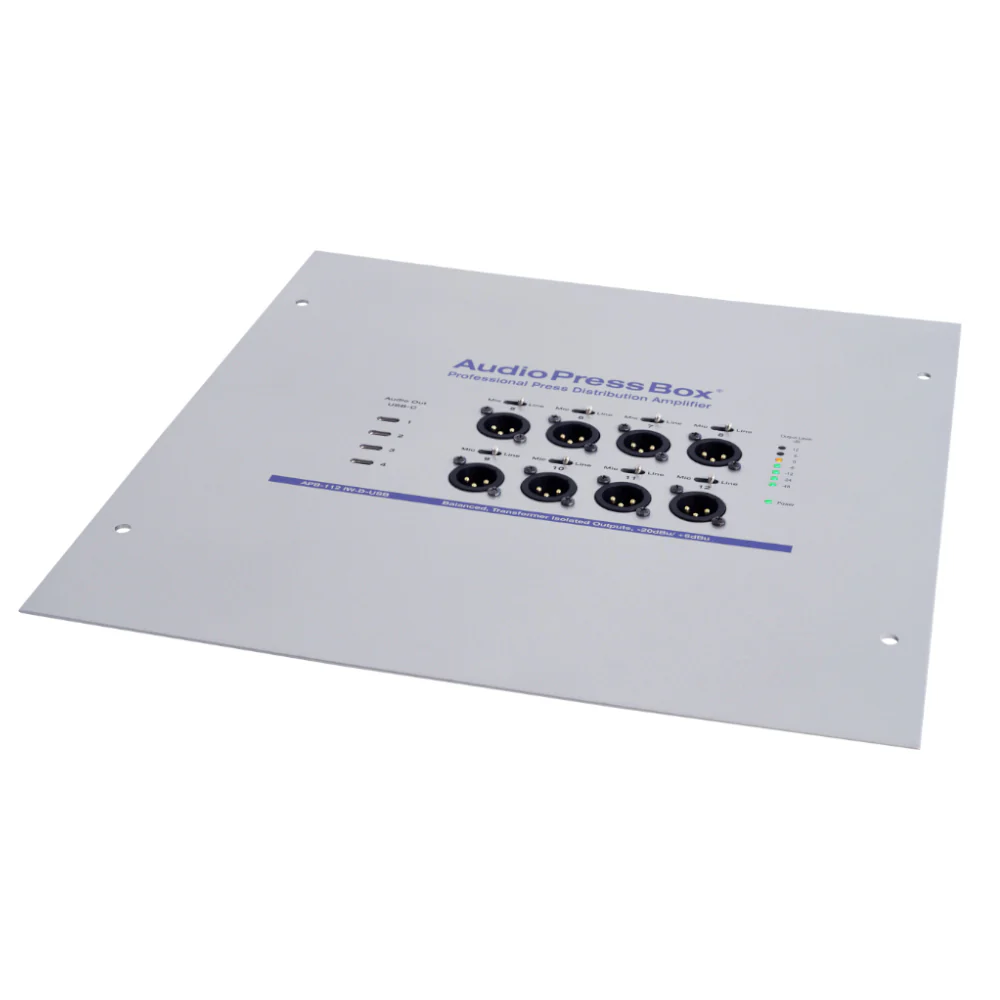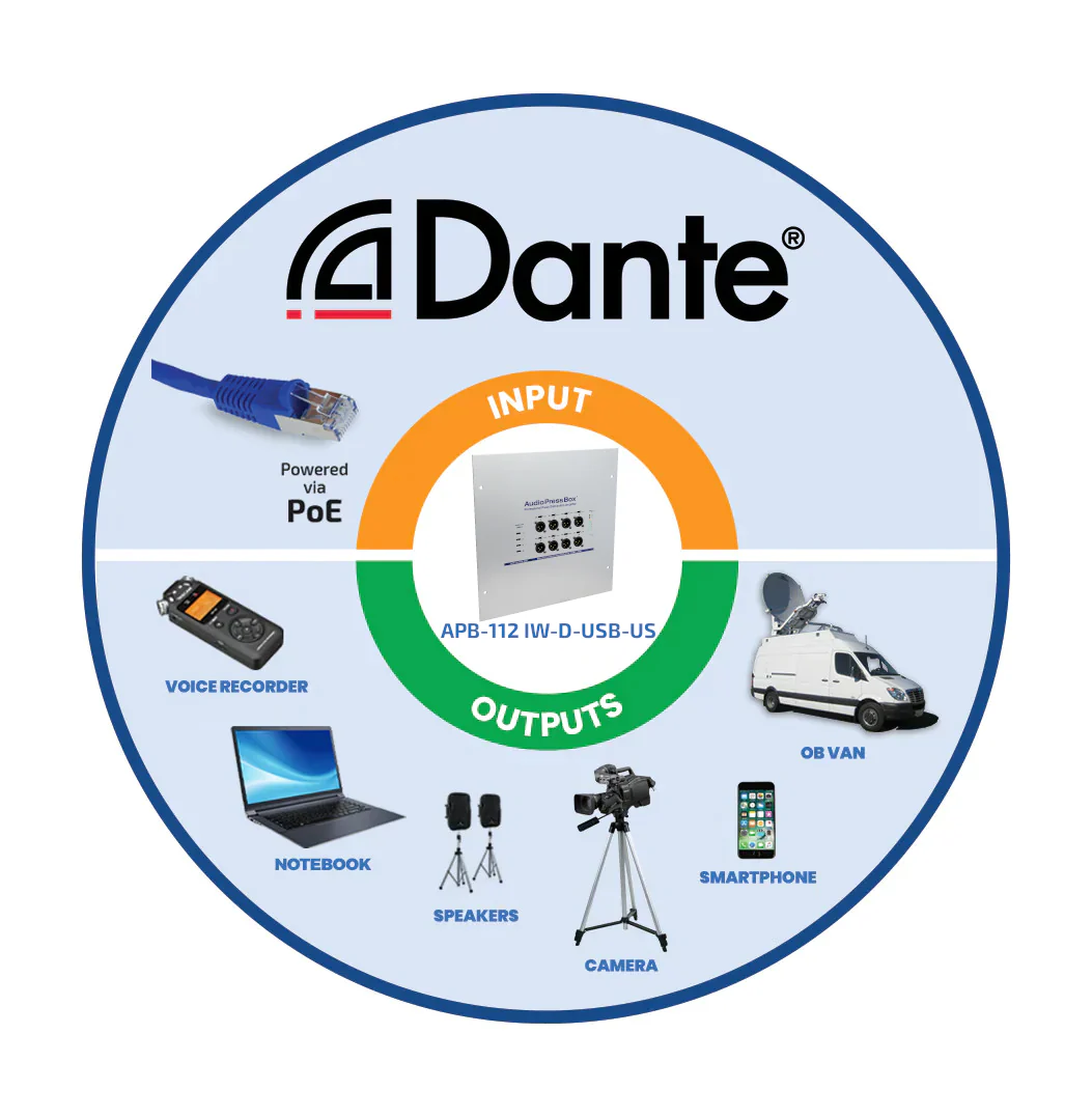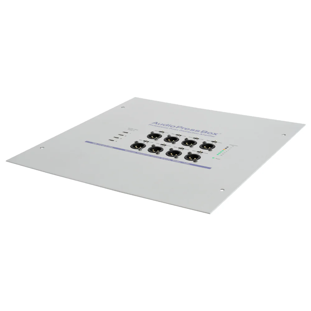 Professionelle, aktive AudioPressBox für den Wandeinbau mit 1 Kanal DANTE-Eingang, 8 LINE/Mic-Ausgängen und 4 USB-C-Ausgängen. Sie wird über PoE mit Strom versorgt, so dass Sie nur 1 Kabel für das Signal und die Stromversorgung benötigen. Die einfache Installation mit einer kompatiblen Nema-Box ermöglicht eine schnelle Einrichtung.