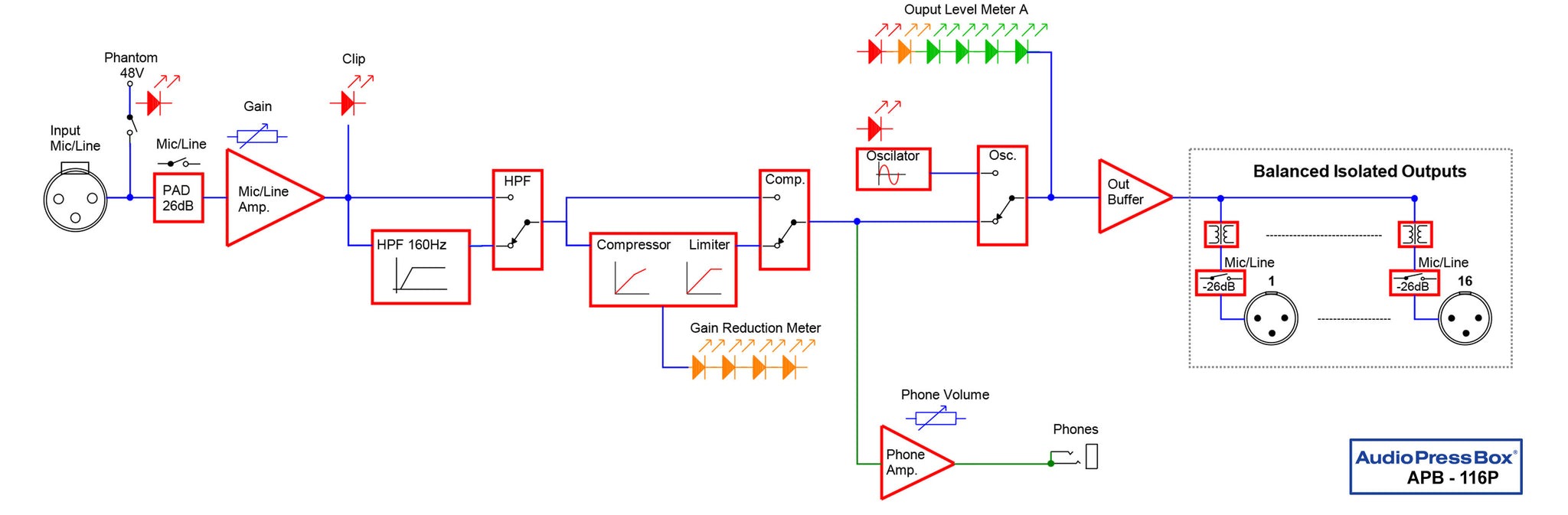 | Controls | Mic/Line PAD, Input gain, Phantom, High-pass filter, Compressor, Oscillator, Phones level, Power, Output PAD |