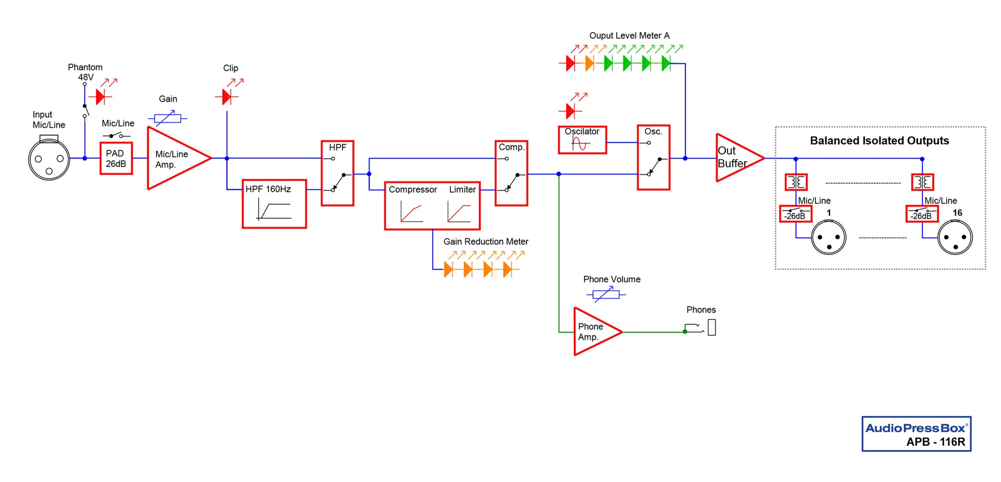 | Controls | Mic/Line PAD, Input gain, Phantom, High-pass filter, Compressor, Oscillator, Phones level, Power, Output PAD |