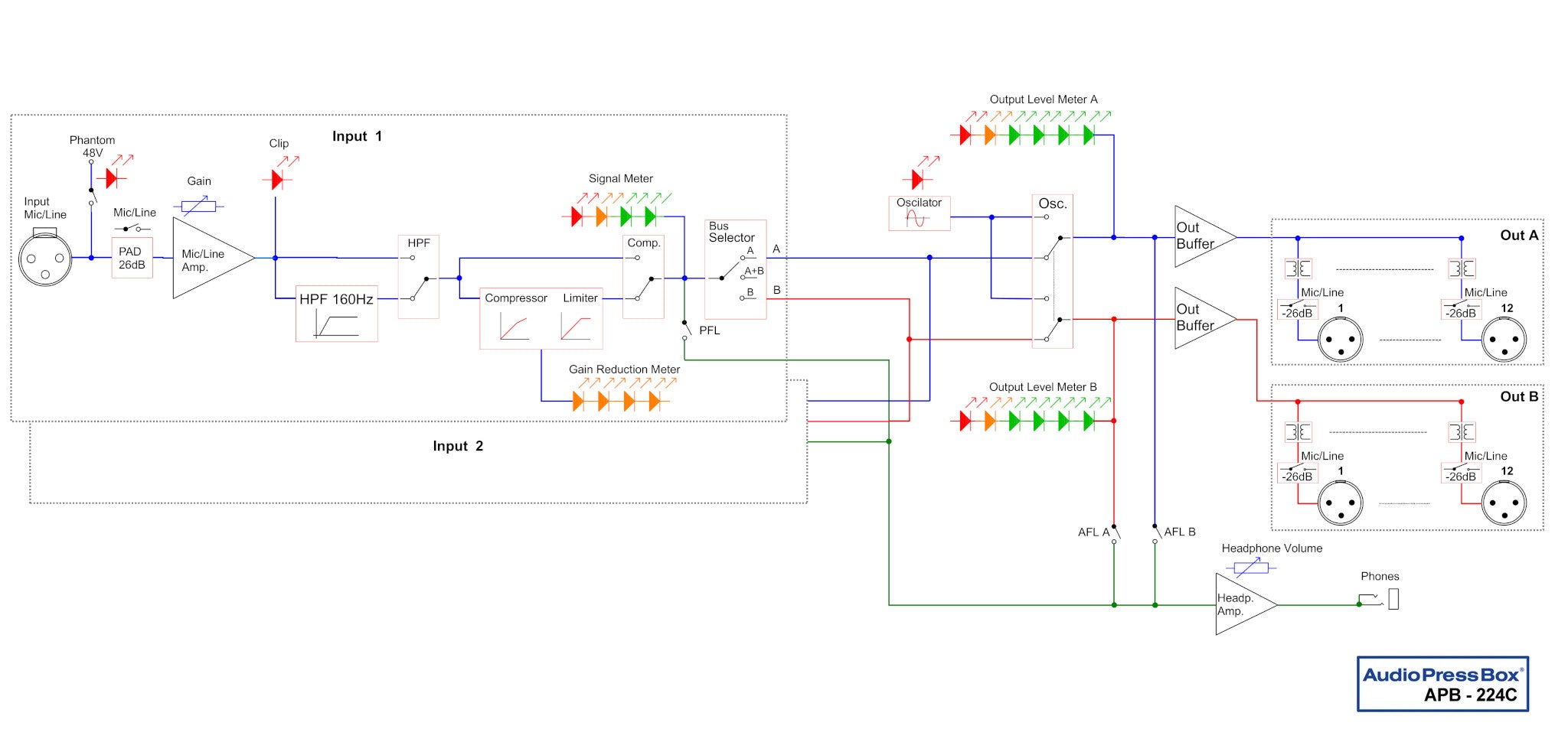 | Controls | Input section: 26dB PAD, Input gain, Phantom, High-pass filter, Compressor, PFL, routing switch Output section: Oscillator, Output level for bus A and bus B, AFL for Bus A and Bus B, Phones level, Power, Output PAD |