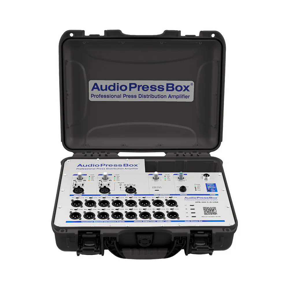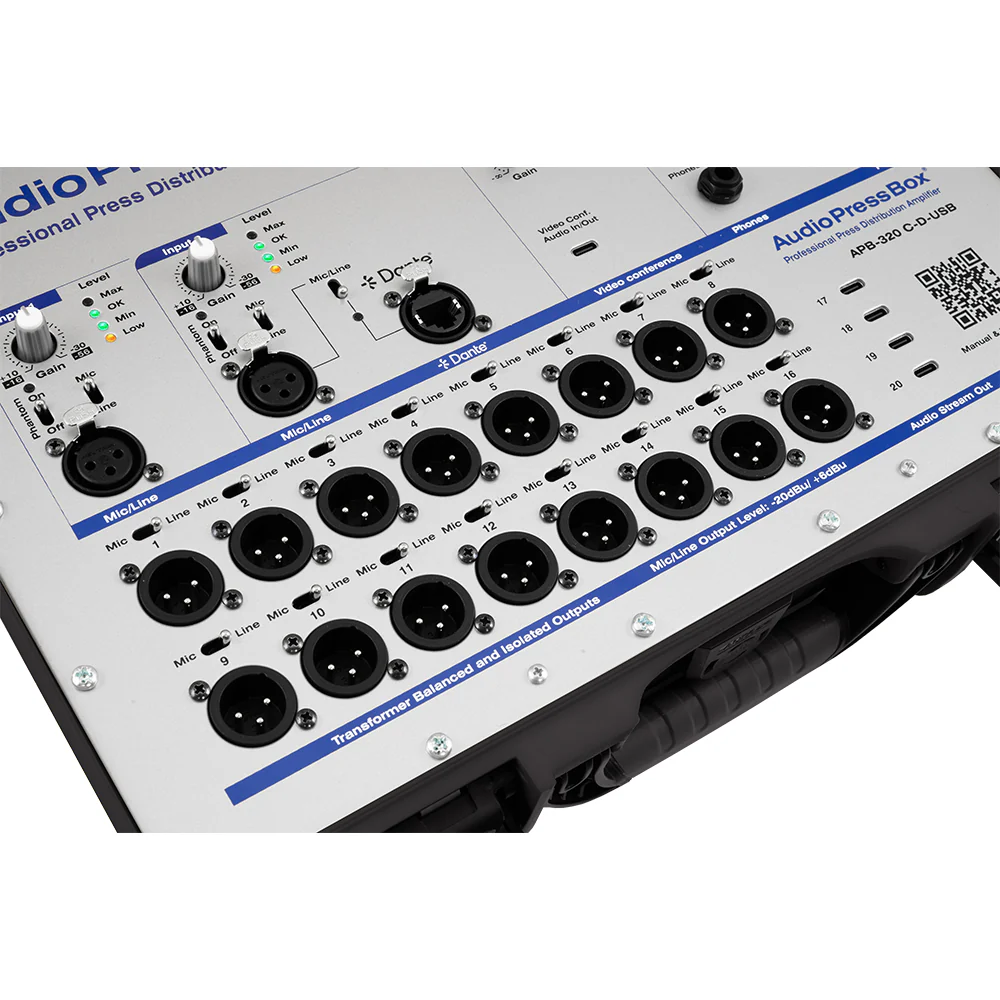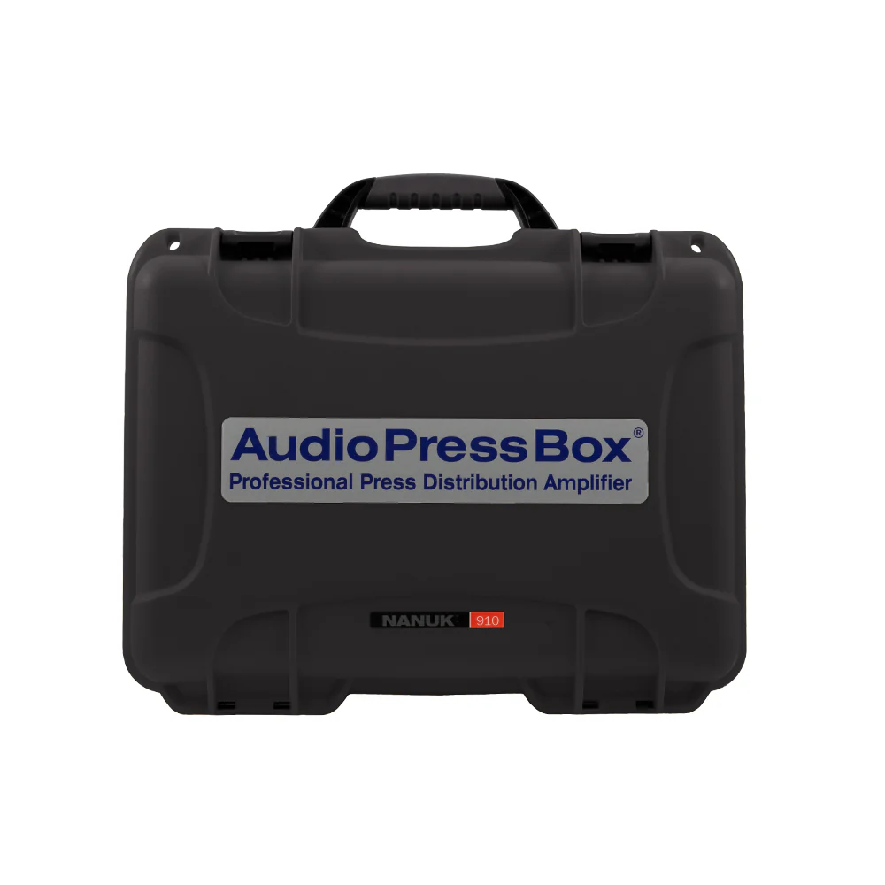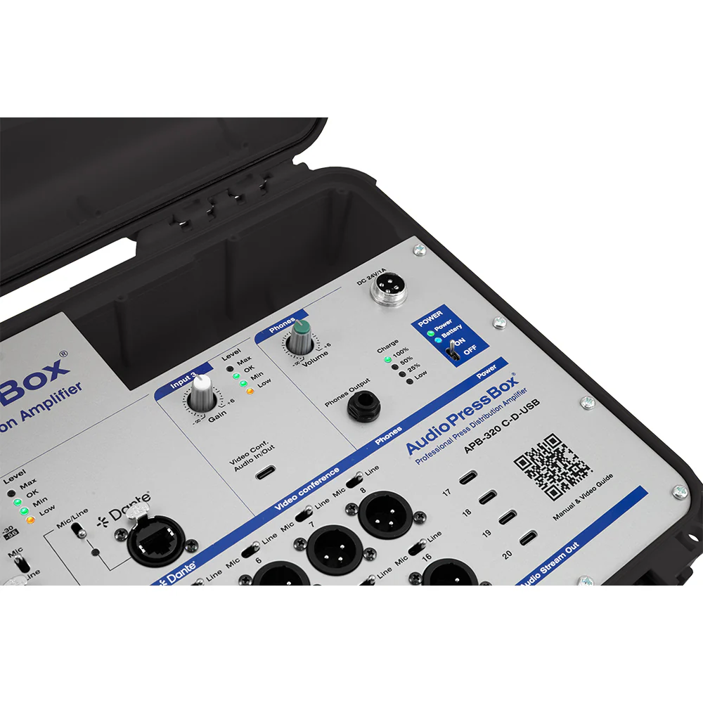 Professionelle tragbare, aktive Pressebox mit 2 analogen Mic/Line-Eingängen, 1 Dante-Eingang, 1 digitalem USB-C-Eingang und -Ausgang. 16 analoge XLR-Mic/Line- und 4 digitale USB-C-Ausgänge. Ausgang für Telefone. Dank des eingebauten Akkus und des robusten Nanuk-Gehäuses ist es sowohl für Pressekonferenzen im Innen- als auch im Außenbereich geeignet. Der USB-C-Anschluss ermöglicht auch einen Videokonferenz-Ein- und -Ausgang für eine Hybrid-Pressekonferenz.