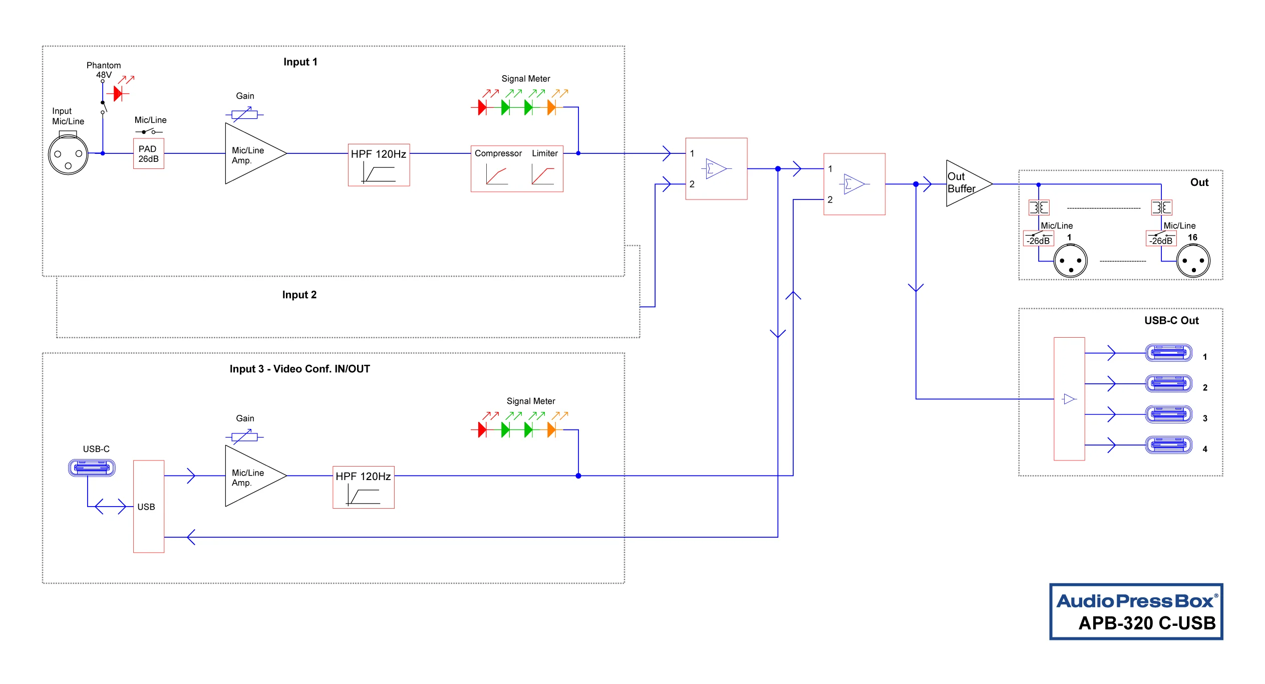 - Eingebauter Kompressor und Limiter für analoge (XLR) Eingänge