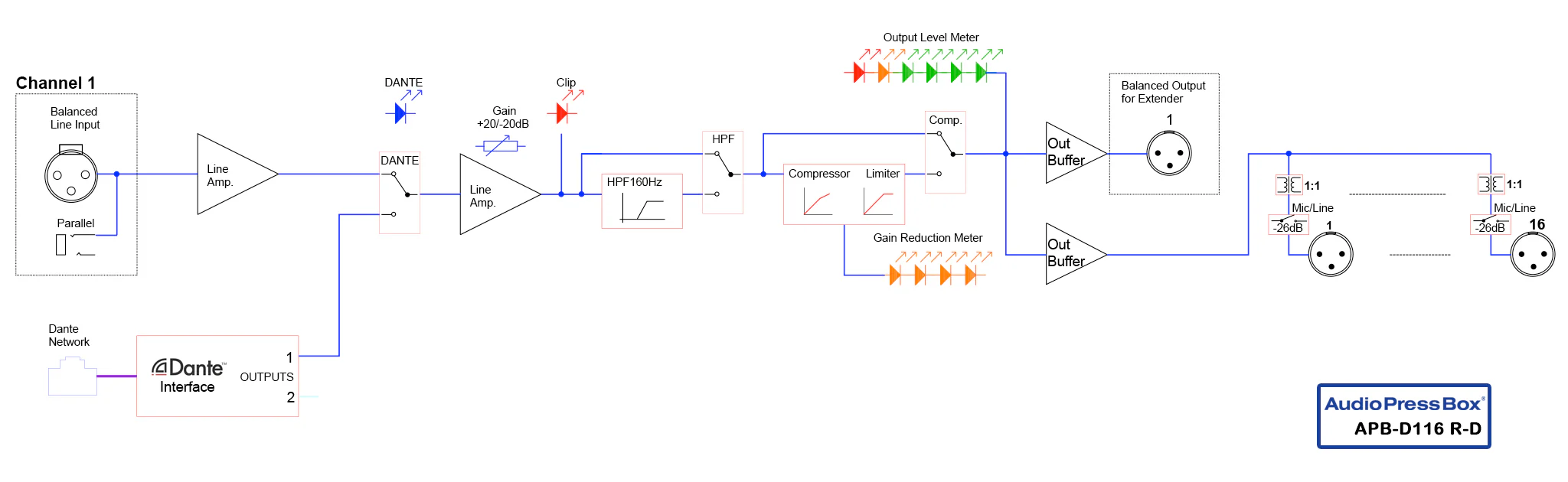 1-Kanal-Aktivlautsprecher mit 1 Analog- und DANTE-Eingang mit hochwertigem Digital-Analog-Wandler. Sie können zwischen Line- und Dante-Eingang umschalten, je nach Bedarf. Er bietet 16 Line/MIC-Level-Ausgänge auf der Vorderseite und einen Ausgang für Expander auf der Rückseite. Die Ausgänge auf der Vorderseite sind symmetrisch und einzeln über einen Transformator isoliert, wobei der Ausgangspegel für jeden Ausgang wählbar ist.