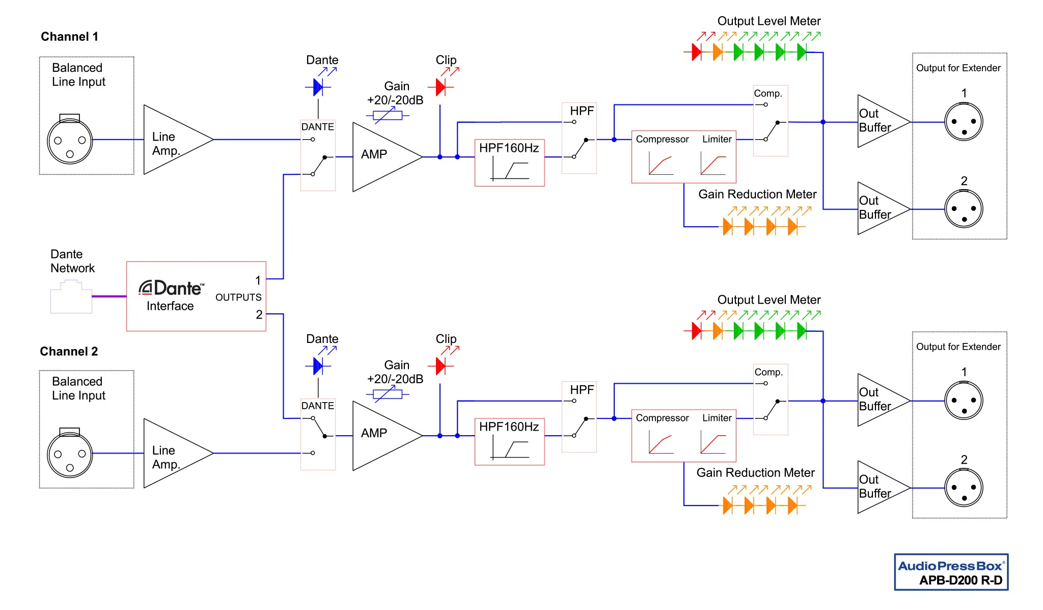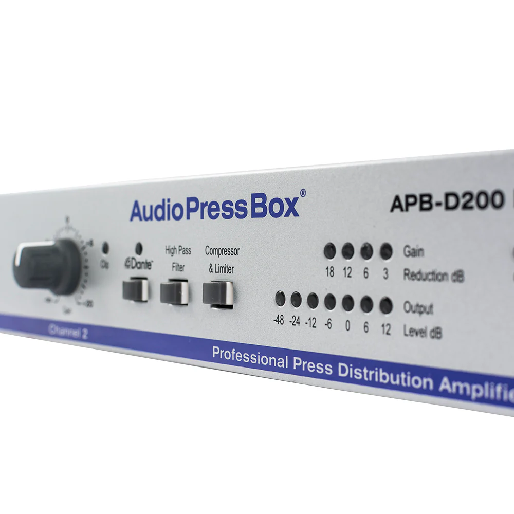 Die APB-D200 R-D verfügt über analoge und DANTE-Eingänge mit hochwertigen Digital-Analog-Wandlern, die eine Reihe von Abtastraten und Bittiefen unterstützen. Er kann einen Hardware-Mastertakt für ein Dante-Netzwerk bereitstellen. Wie bei anderen Dante-Produkten wird die kostenlos erhältliche Softwareanwendung Dante Controller zur automatischen Erkennung und Konfiguration der mit dem Dante-Netzwerk verbundenen APB-Dante-Geräte verwendet. Gerätenamen, Kanalbezeichnungen, Signalrouting und andere Parameter (z.B. Abtastrate und Latenz) können mit Dante Controller über das Netzwerk konfiguriert werden. Eine Vielzahl von Diagnosewerkzeugen für das Netzwerk und die Taktsynchronisation sind ebenfalls in Dante Controller verfügbar.