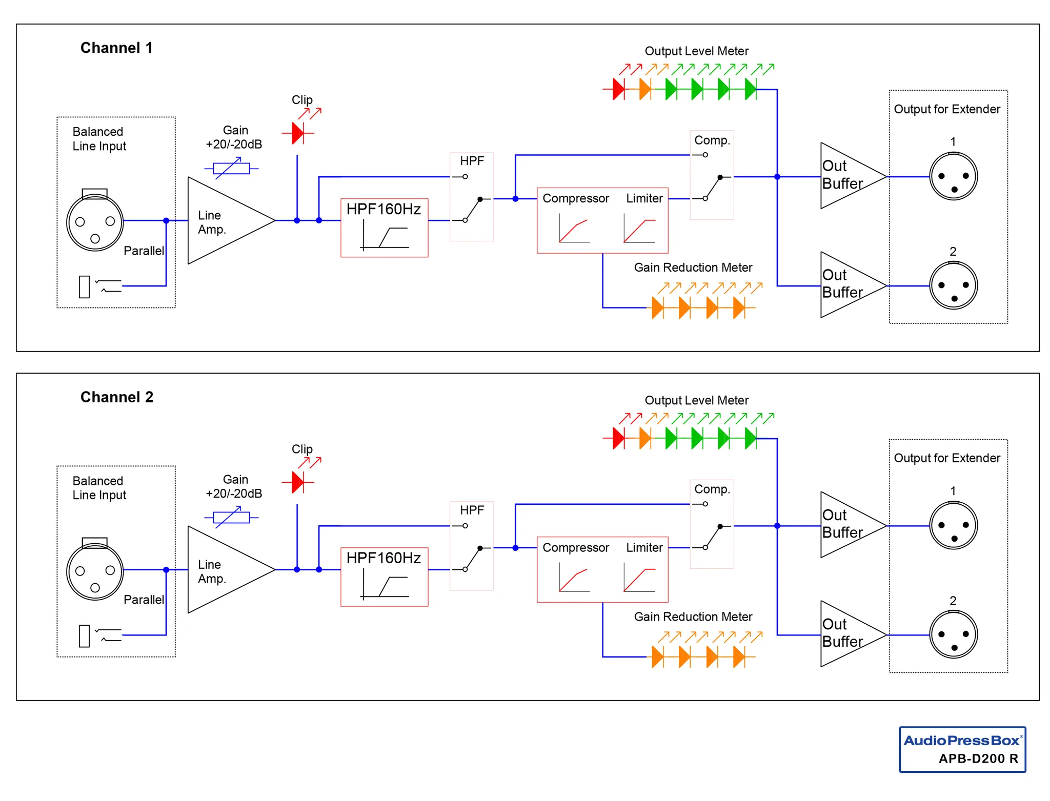 | Outputs | 4 separately buffered, balanced outputs for AudioPressBox expanders |