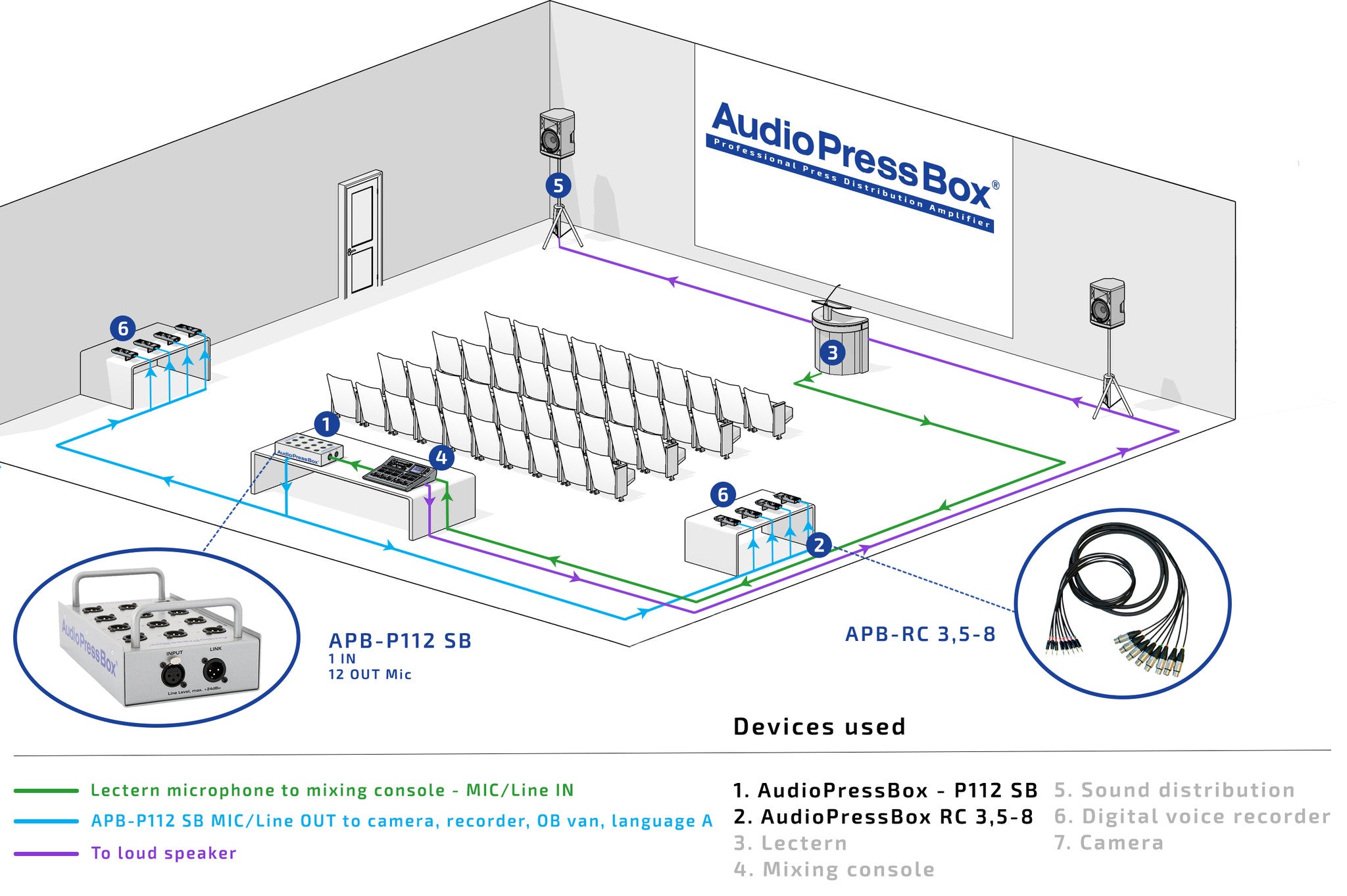Ein professionelles , tragbares, passives Pressefach (Audio-Splitter), das sowohl für Pressekonferenzen im Innen- als auch im Außenbereich geeignet ist.